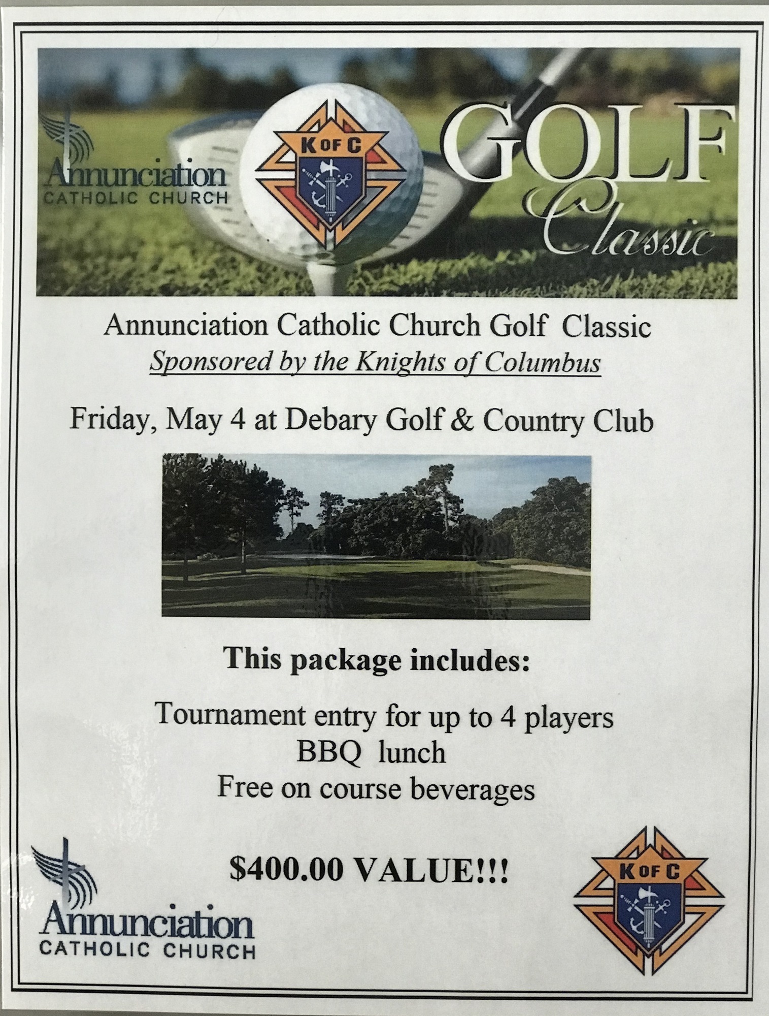 Golf Annunciation Catholic Church Golf Classic sponsored by the Knights of Columbus. Package includes tournament entry for up to four (4) players, BBQ & on-course beverages. DeBary Golf & Country Club, May 4th 8am.