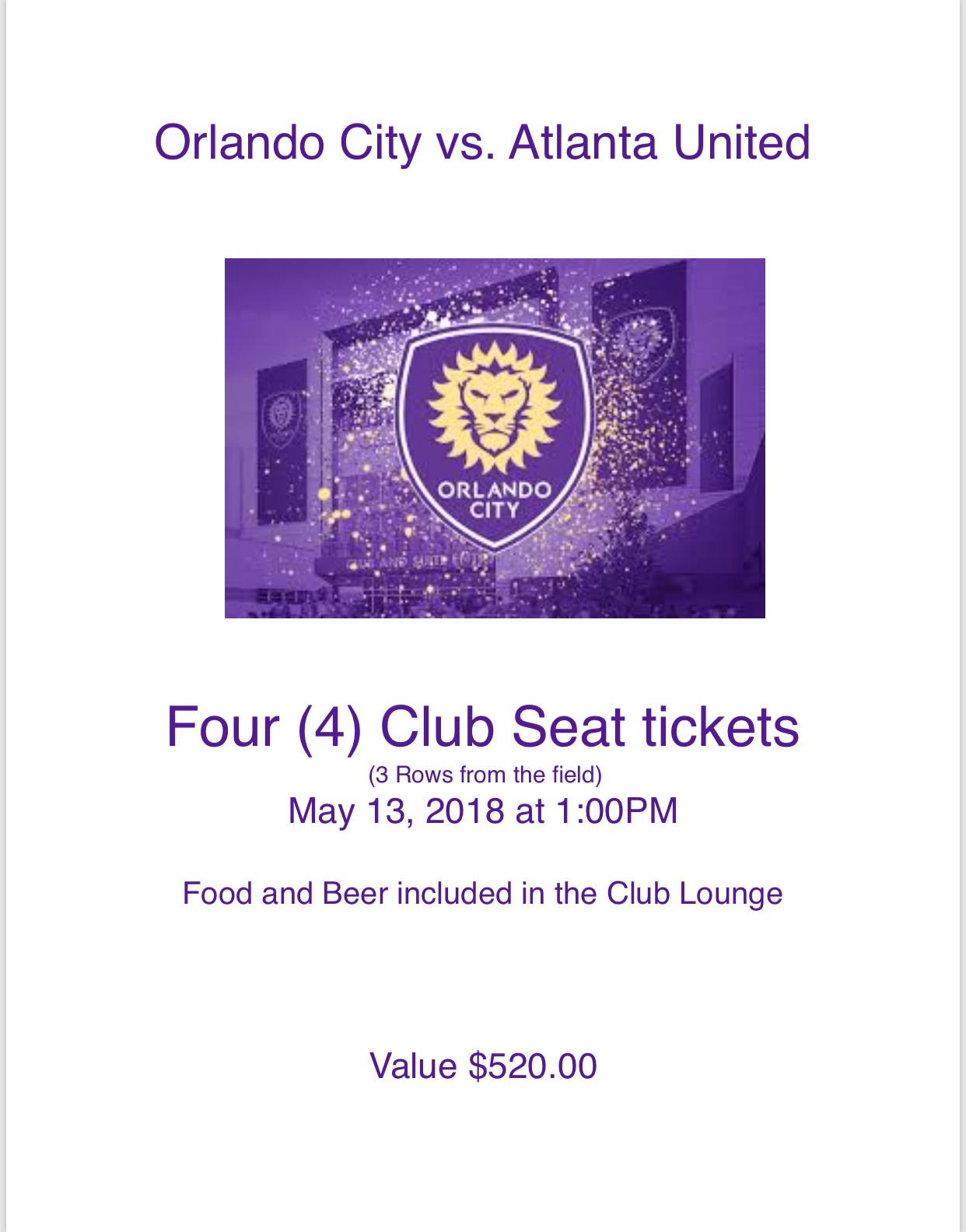 Have a great time during the Orlando City soccer game just three rows up from the field! Four (4) club seat tickets for the game on Sunday May 13, against the Atlanta United. Game starts at 6:00pm. Food and beer are included at the Club Level Lounge.
