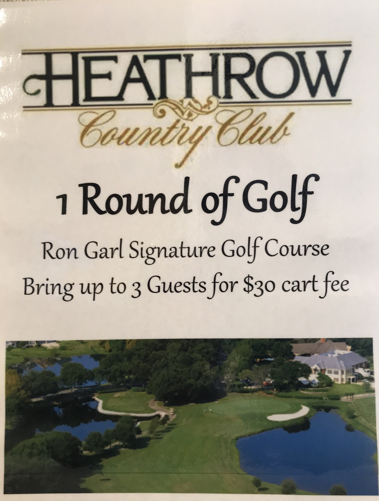 Heathrow Country Club Play Certificate for one (1) round on the 18-hole Ron Garl Signature Golf Course. Bring up to 3 Guests for a $30 cart fee.