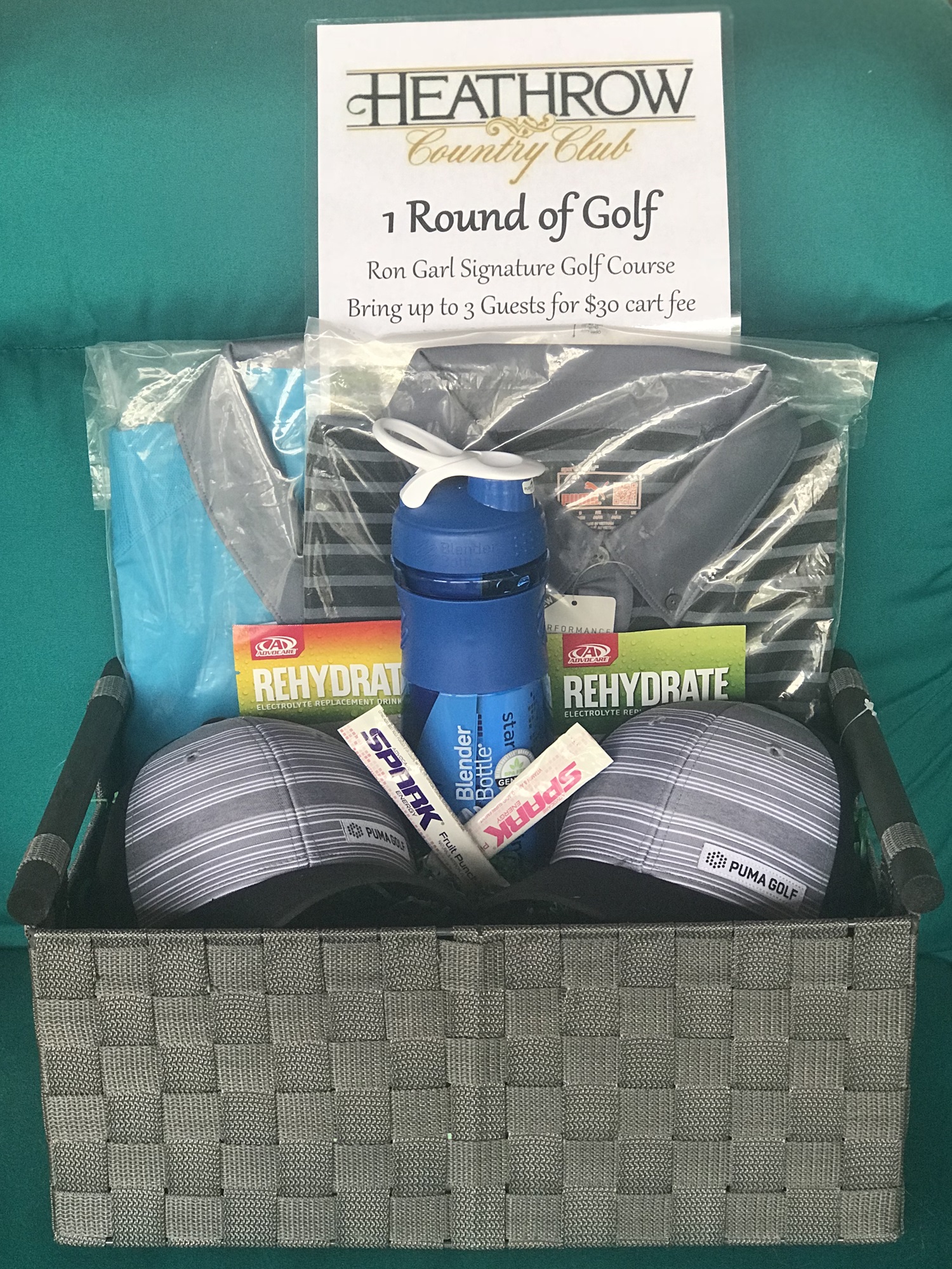Basket includes two (2) XL PUMA polos, two (2) PUMA hats, a shaker cup and Advocare Spark & Rehydrate.